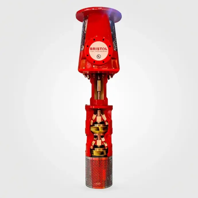 Bristol vertical turbine centrifugal pump is developed and fabricated in accordance to NFPA 20. It is used for any underground water source where the water level is below the ground level. The pump’s impeller remains submerged with the water tank at all times and supported by column pipe.